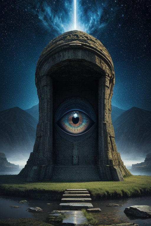 masterpiece, best quality, absurdres, illustration, photorealistic, monster, eldritch monster, colossal eye, ethereal tentacles, cosmic void, ancient inscriptions, floating monoliths, dark stars