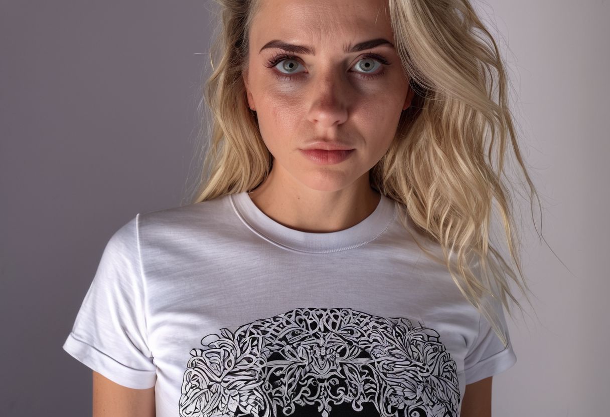8k, RAW photo, highest quality), beautiful (white skin woman), close up, dress, (detailed eyes:0., (looking at the camera:1.4), (high-resolution image), (best shadow) , skin textures, intricate details wear t shirt and pant standing hair blond