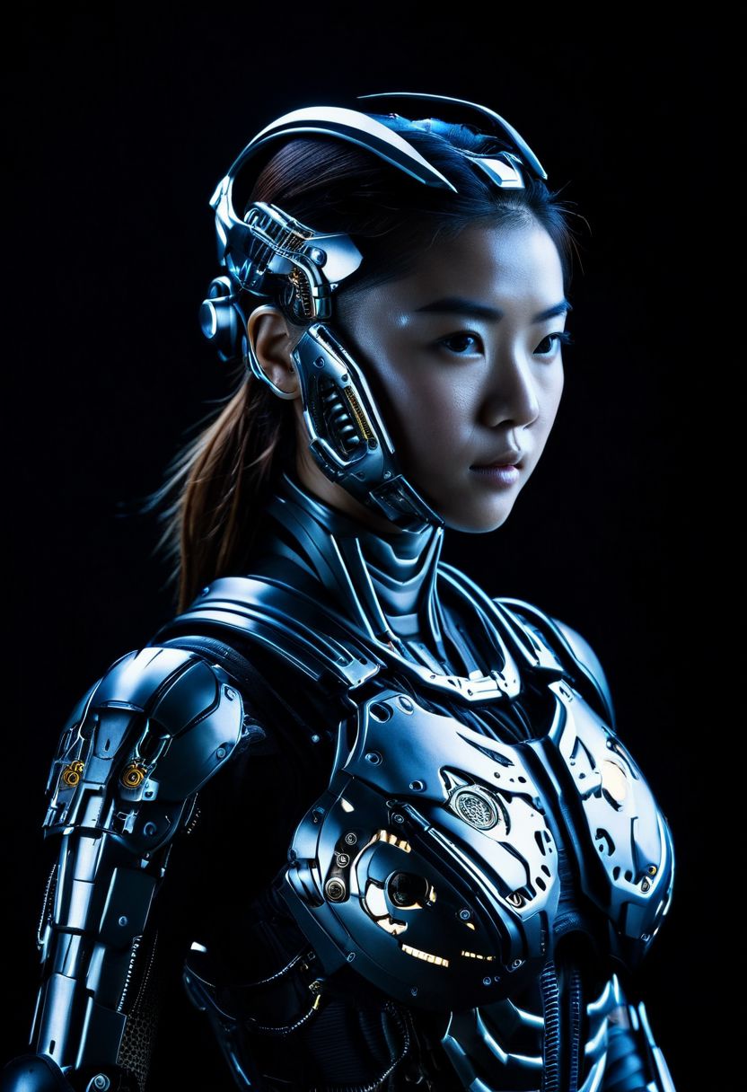 Beautiful japanese cyborg girl wearing brand new combat armour, synthetic skin panels opening away from her endoskeleton, staring at the camera, upper torso and face depicting intricate mechanical detail, captured by a Black magic Design Camera, film directed by Christopher Nolan, rim lighting, dark background high saturation candid cover style --ar 4:5 --style raw --v 6.0