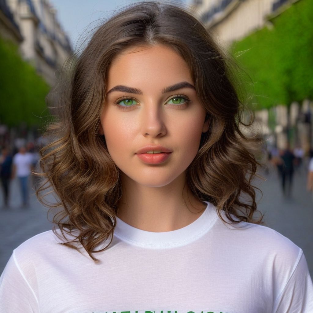 "A photorealistic portrait of a 29-year-old American girl with long sultry light brown wavy hair and piercing green eyes, and full but natural lips. Oval shaped face but nice defined cheek bones. Wearing white zee-through t-shirt. She should have naturel , walking in paris city