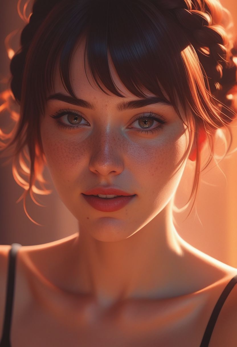 style by Ilya Kuvshinov best quality image of a hell-atmosphere, phenomenal playful shadows,amazing realistic light from above,majestic-braided hair,mesmerise-naughty,light-freckles-sunburned-face,party-makeup,tattoo,breathtaking crispy-detailed, thick-lips, realistic-eye,unscrupulous-smile aesthetic joyful souleater1phantom in a casting seat