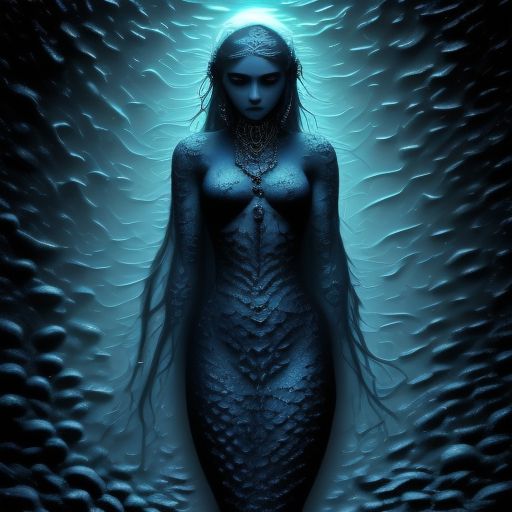 Fullbody black and white photography, beautiful gothic mermaid with flowing locks adorned with pearls and coral, under water, sad face, crying, heterochromia eyes blue and black, 8k, intricate detailed, anne stokes inspired