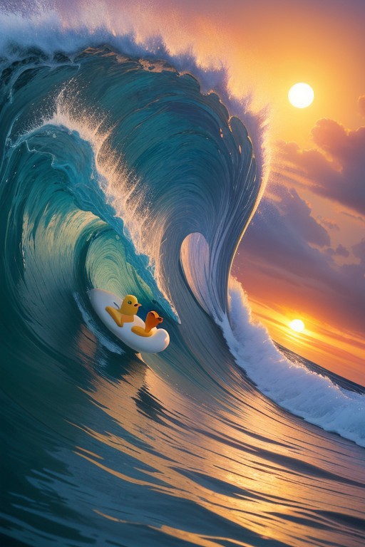 (ultra high res:1.4), (masterpiece), (beautiful lighting:1.4) , raw movie poster, (masterpiece, best quality:1.5), ral-apoctvisn, dark, chiaroscuro, low-key, Create an intense and captivating scene featuring a tiny, lost rubber ducky, adorned with stylish sunglasses, embarking on a daring surfing adventure amidst colossal waves. The action shot captures the rubber ducky inside the tube of a massive wave, evoking a sense of excitement and peril. The rubber ducky's expression conveys a mix of determination and vulnerability, highlighting its solitary journey through the tumultuous waters. The setting sun paints the sky with a radiant palette of warm, golden hues, with shades of orange and pink casting a mesmerizing glow over the expansive ocean. The contrast between the small, lone rubber ducky and the vast, imposing waves enhances the feeling of isolation and insignificance in the face of nature's power. The dynamic composition of the scene emphasizes the rubber ducky's struggle against the elements, creating a visually striking and emotionally evocative artwork.