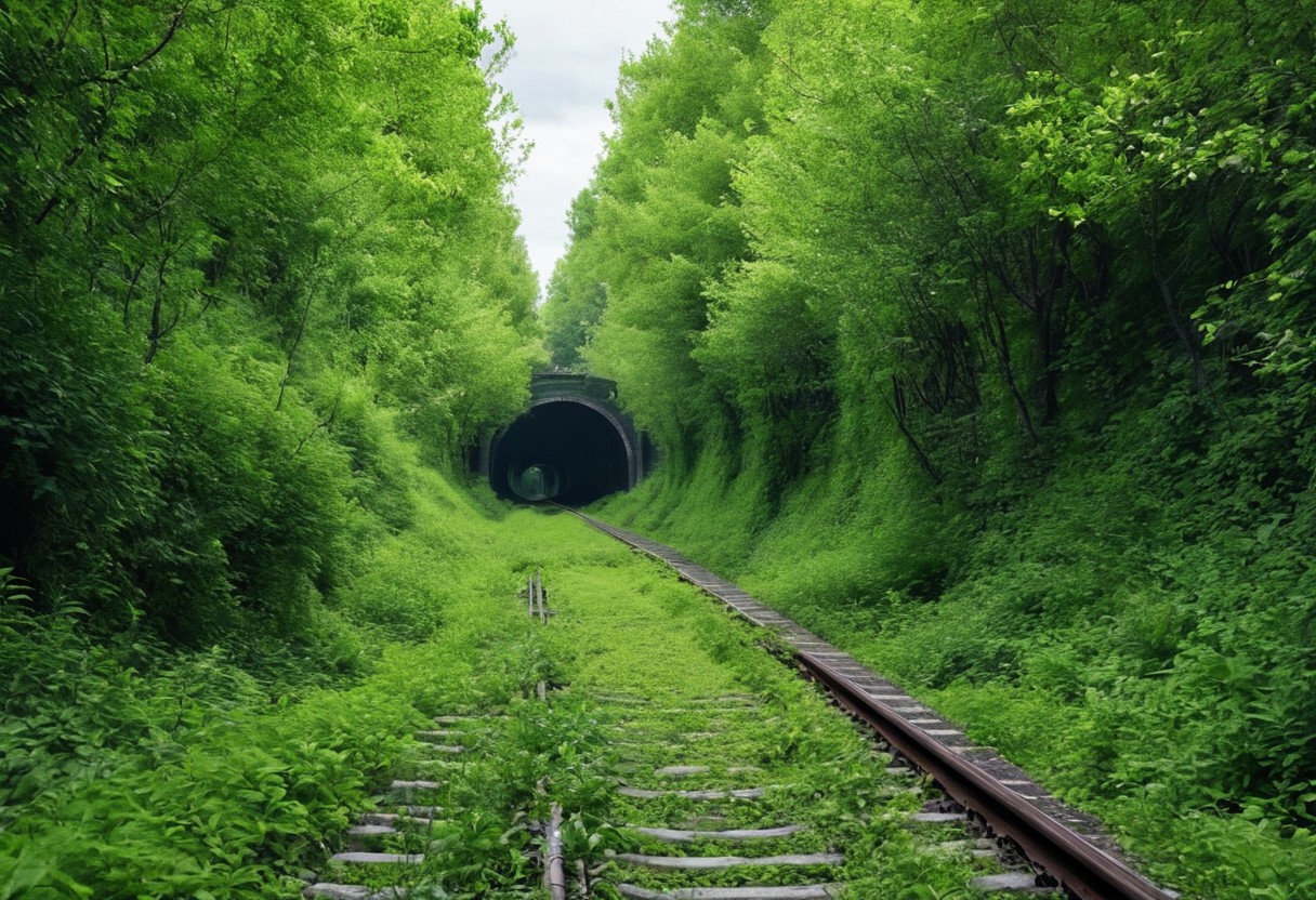 realistic, extremely high quality RAW photograph, intricate, Exquisite details and textures, highly detailed, ultra detailed photograph, 4k, high resolution, natural passage formed by trees and foliage that intertwine on a train track, train tunnel. The vegetation is lush and creates an almost perfect arc over the tracks, which extend towards the background of the image, converging at a vanishing point that gives depth to the scene. This place is often associated with romance due to its picturesque and charming appearance. It is a landscape that invites reflection and enjoyment of nature. The lighting is natural, probably filtered through the leaves of the trees, creating a serene and magical atmosphere. The color is mainly green due to the dense vegetation, with different shades ranging from light to dark greens, which adds a rich visual texture to the scene. These elements together provide a calm and charming viewing experience, perfect for a romantic walk or solitary reflection.