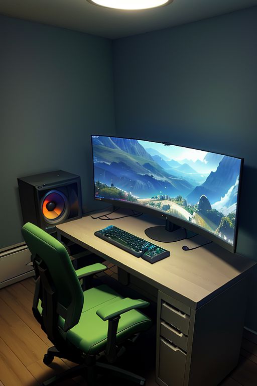 a ginger girl playing games on a desktop computer BREAK (a computer) with keyboard and wide screen monitors on a desktop with a (gaming chair) BREAK in a modern and dark gaming data center (full of computer racks with rgb lights and watercooling pipes) BREAK dolly zoom, dutch angle, lens flare, sharp focus, intrincate details, isometric view
