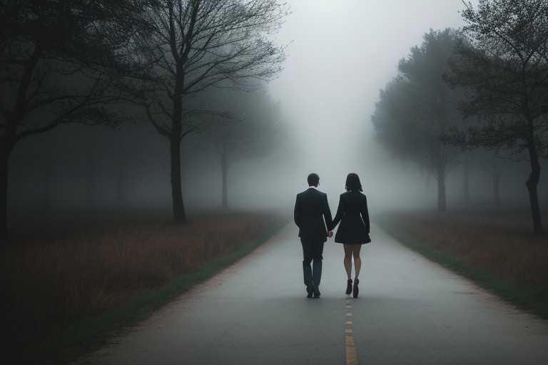 (ultra high res:1.4), (masterpiece), (beautiful lighting:1.4) , raw movie poster, (masterpiece, best quality:1.5), 50s old noir French cinema; masterpiece, extremely detailed, a moody candid image of a couple walking hand in hand through a foggy park, the mist and muted colors create a sense of isolation and quiet intimacy, realistic, HD, retro film, film grain, OverallDetailXL