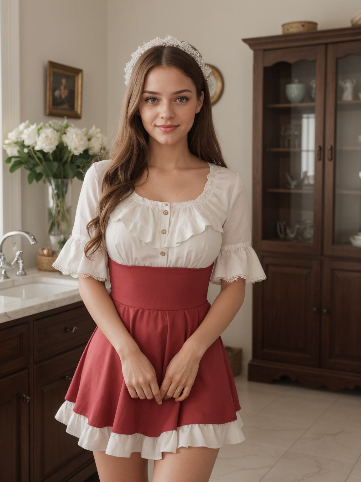 Tower13_Estefania, (GS-Womanly:1.3) (Fashion Photography, Award Winning), photograph, RAW photo, (rule of thirds), character dressed as Red Riding Hood wearing a crimson hooded cape, frilled blouse, layered skirt, comfortable walking shoes, red lipstick, embroidered apron,bonnet, set in public Toilet, Vintage charm, retro tile flooring, brass fixtures, wooden partitions between stalls, framed artwork on the walls, decorative vase with fresh flowers on the sink counter , ponytail hair, perfect teeth, by Steve McCurry, 35mm, F/2.8, ((Photo Focus, DOF, Aperture, insanely detailed and intricate, hypermaximalist, beautiful, revealing, appealing, attractive, hyper realistic, super detailed))(DOF, blurry background), epiCPhoto
