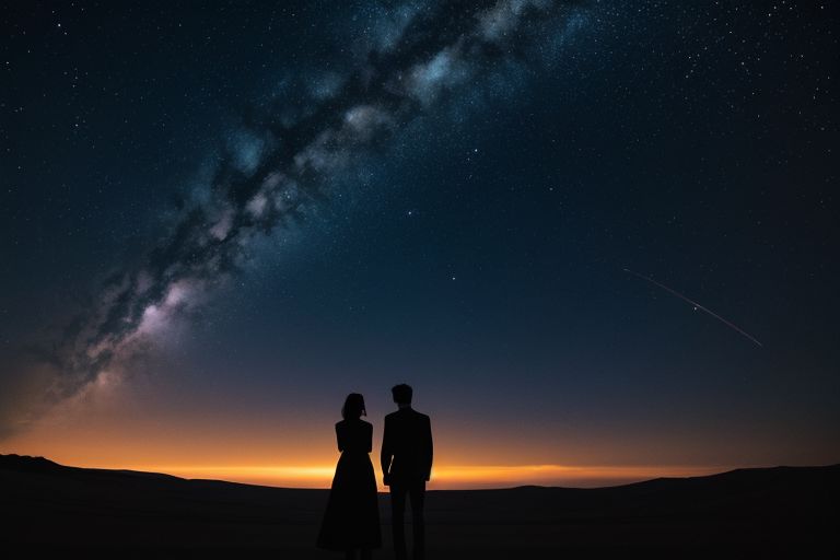 A man and a woman standing with their backs to the camera, side by side, The scene is set under a breathtaking night sky with a narrow strip resembling a segment of Saturn's rings, starting from the center of the frame and tilted to the right at a 30-degree angle from the vertical. The image is in silhouette style, the couple appear as dark shapes against the bright, starry background. sense of greater distance and vastness. Use a wide-angle camera to capture the scene. cinematic light, vibrant colors
