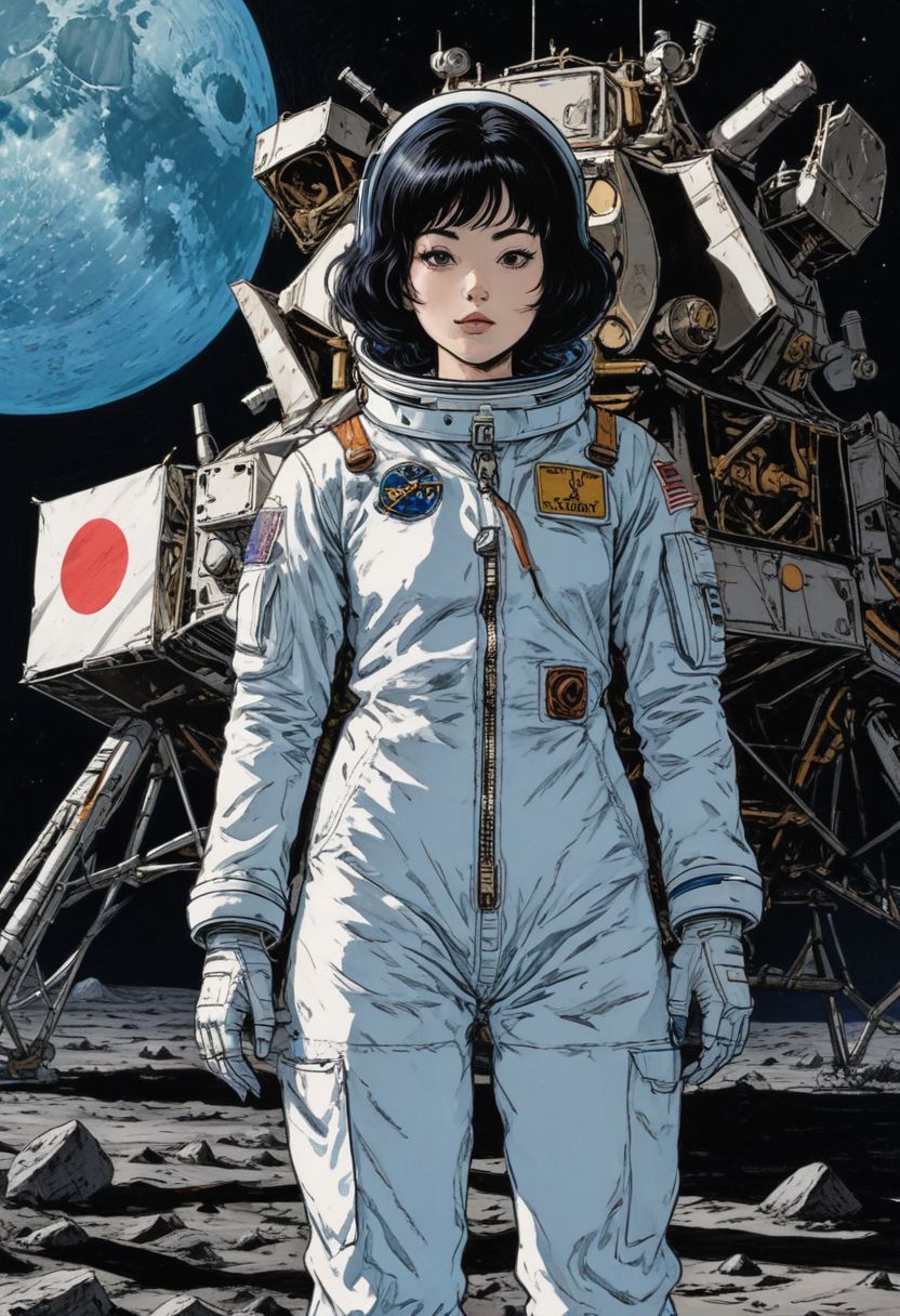 Full body of Tomie Kawakami in a Japan’s white and blue flight suit, standing on the lunar module in the dark side of moon, spaceship in background, graphic novel flat colors style, cropped detail, fine intricate lineart, hatched shadows, amazing textures, sharp focus, thai flag,