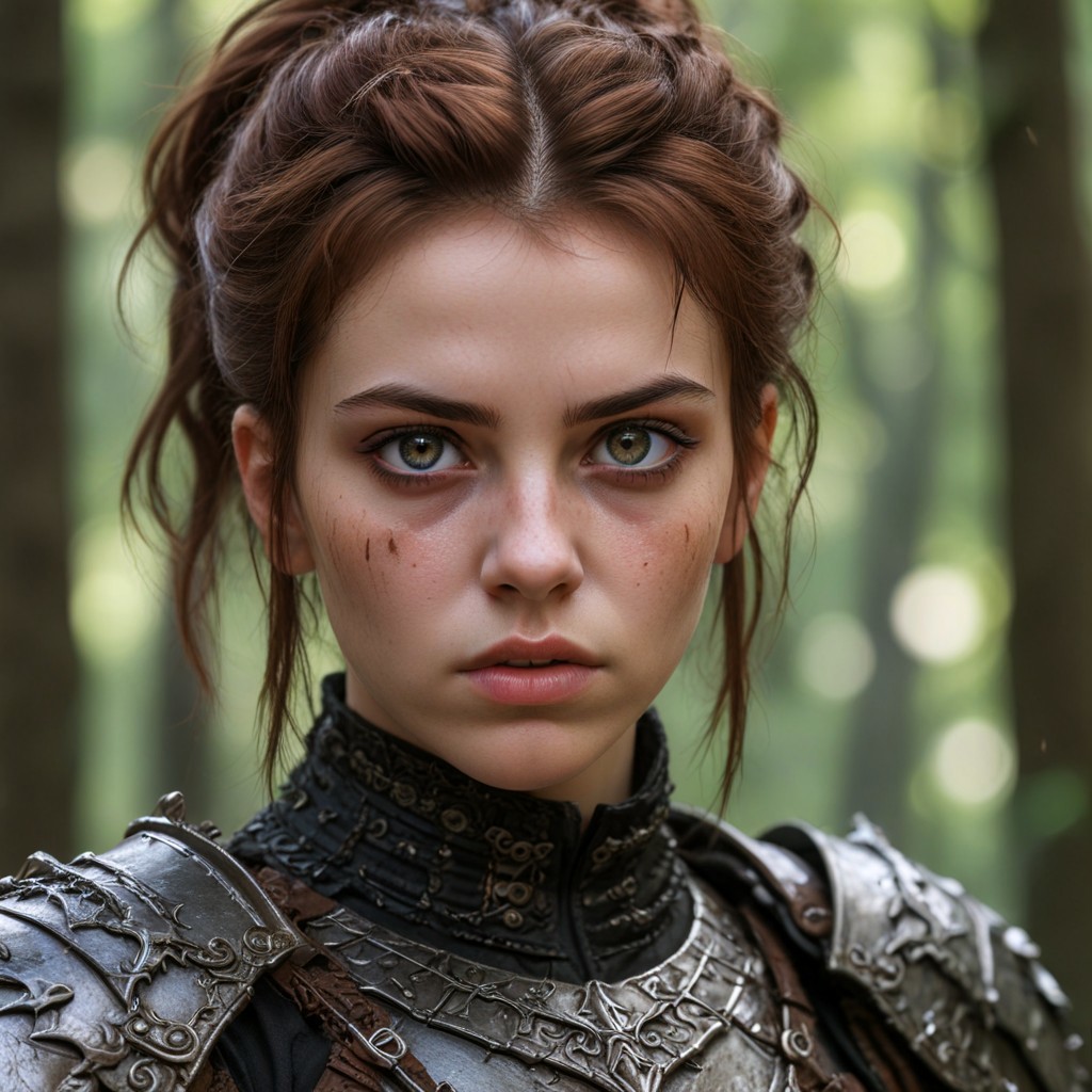 a woman in gothic armor, dueling scar, severe expression, heterochromia, hair up, brown hair, nubian, photorealistic, forest, extreme closeup, photorealism, bokeh, trending on artstation,