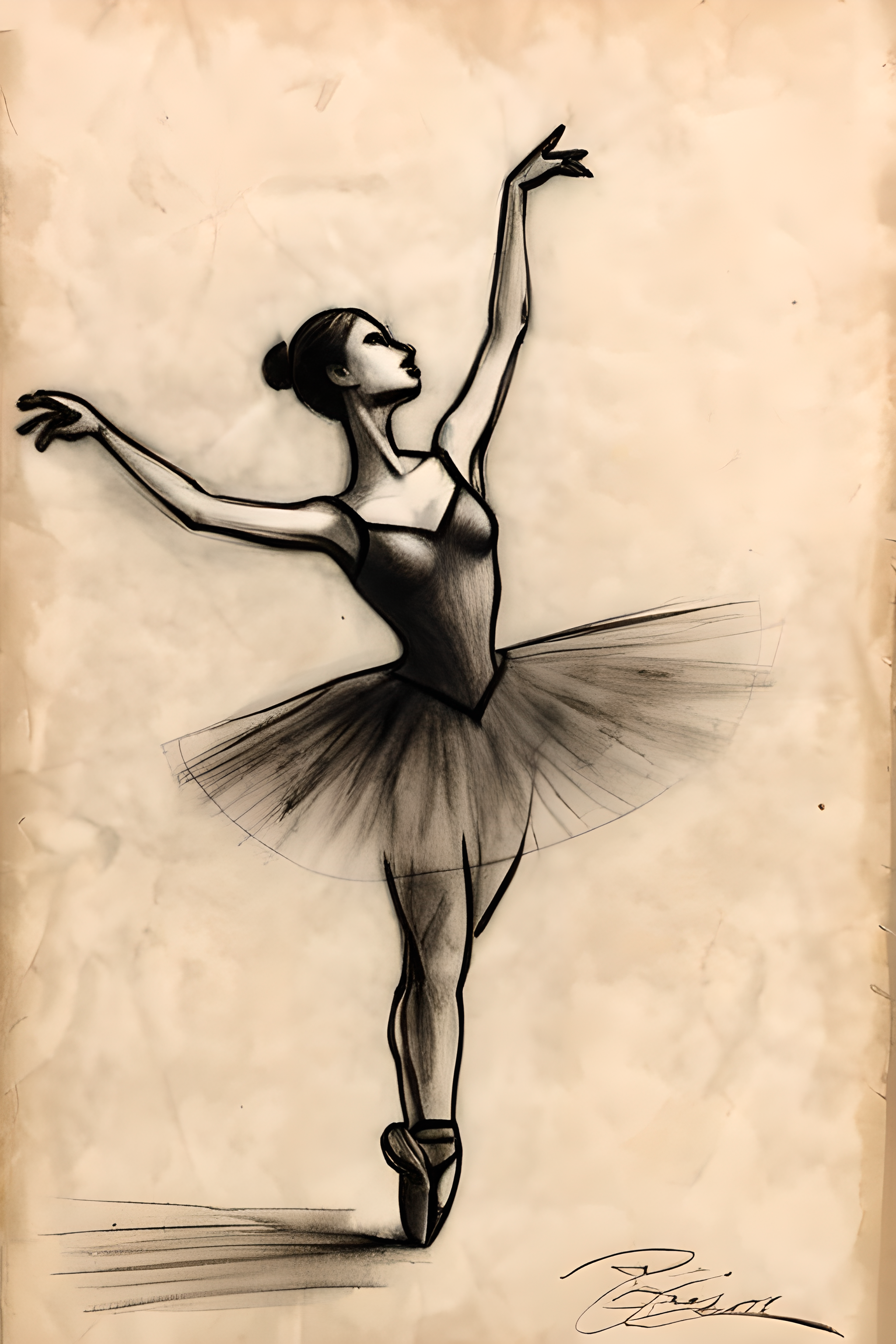 A (rough:1.3) (charcoal:1.1) sketch on parchment of a woman ballerina dancing