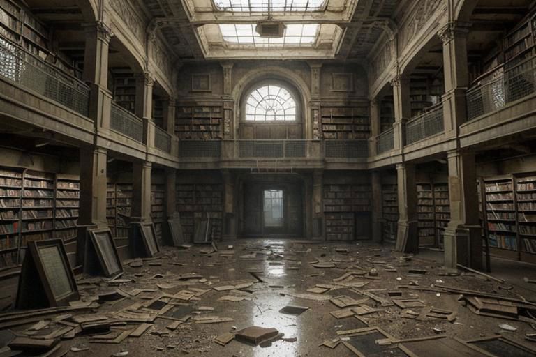 - Description: A desolate post-apocalyptic library interior. Half-empty shelves, books on the floor, dust and cobwebs. Broken window with light illuminating dust. - Theme: Abandoned library, forgotten knowledge. - Atmosphere: Quiet desolation, eerie silence.