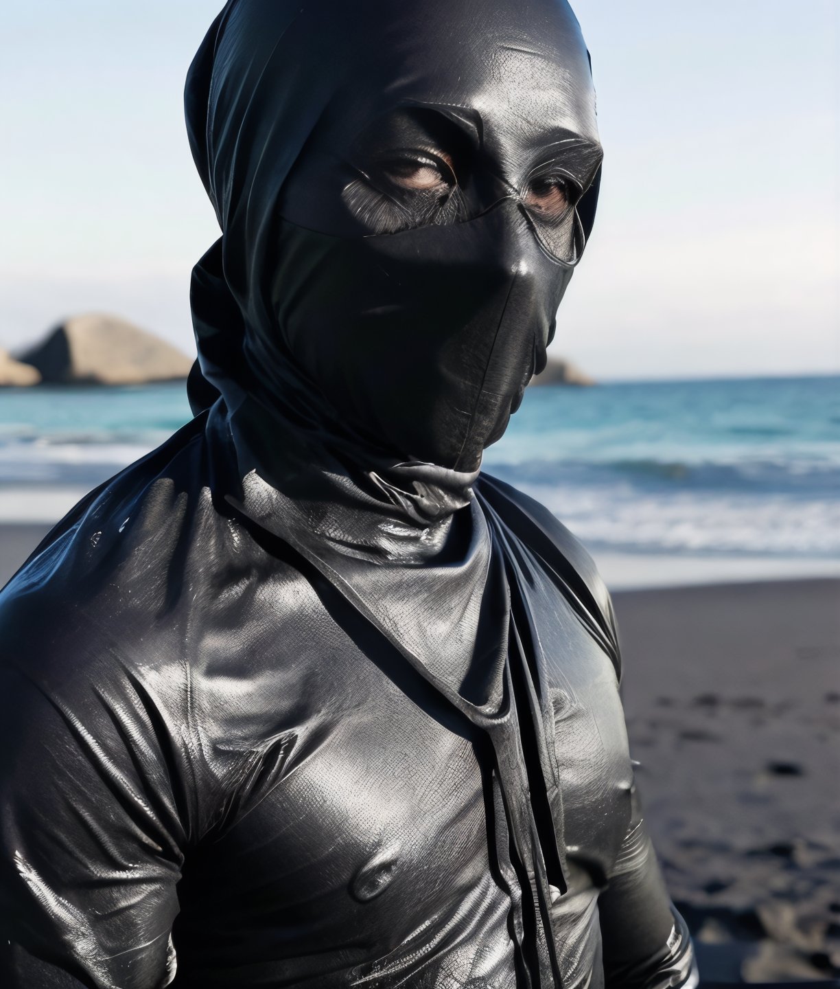 man wrapped in black rubber, mummified, fetish, faceless, gimp, deserted island, hard focus, depth of field