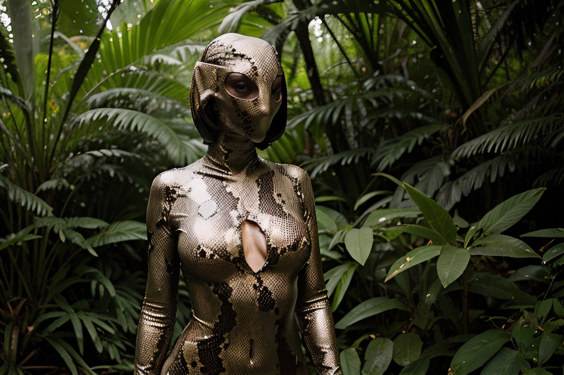 photograph of (faceless) lesbian with perfect body wearing python zentai, Standing with one hand on the chest, looking proud in rainforest, hard focus, depth of field, professionally color graded