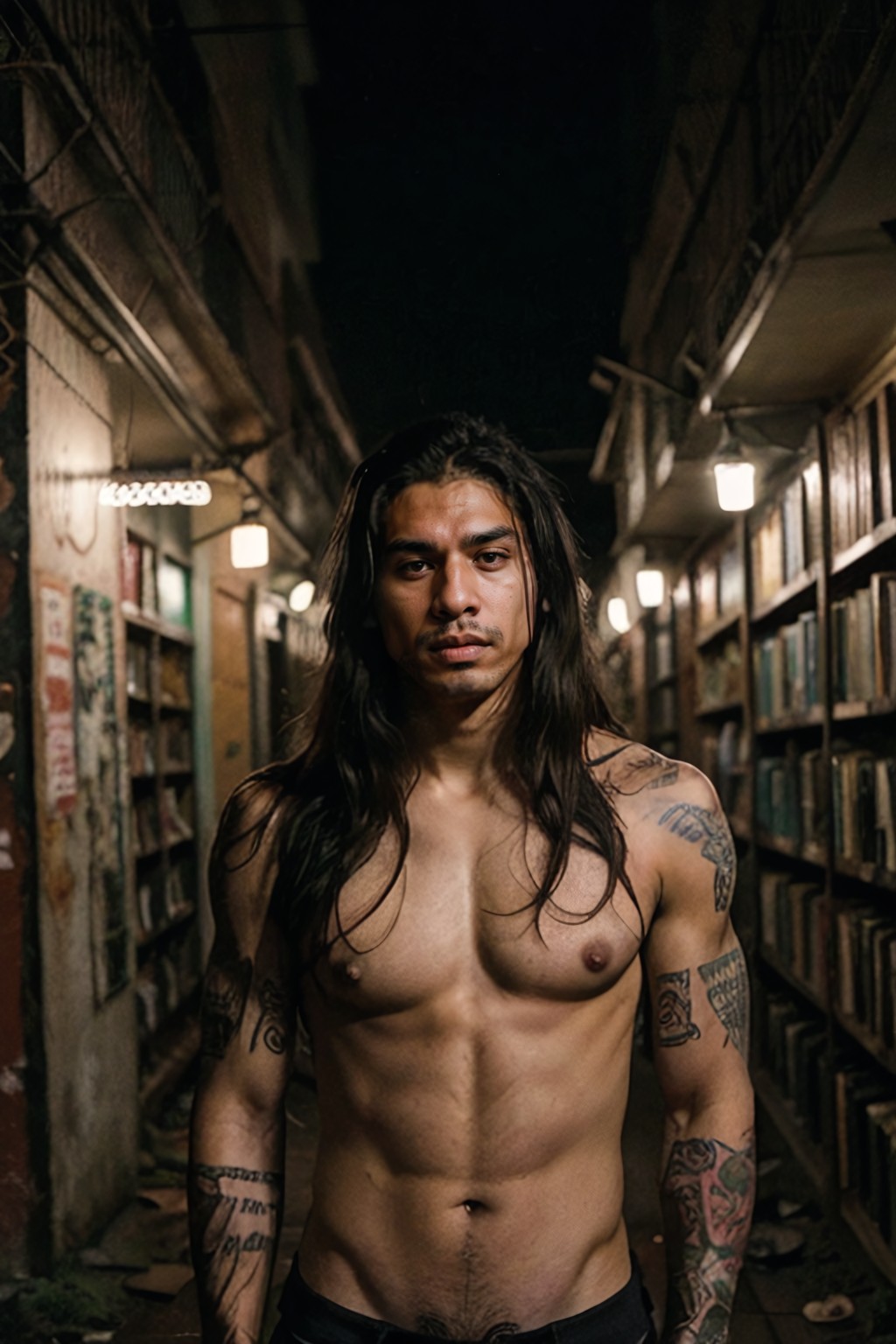 iphone photograph from front of handsome intimidating shirtless fit 21 year old Mexican thug man with gang tattoos and messy long hair, dark abandoned bookstore at night, hard focus, depth of field