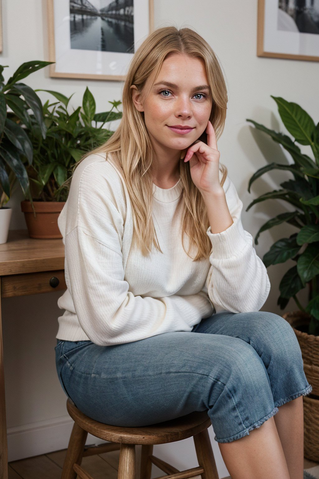 a photo of a beautiful natural blonde Scandinavian woman sitting on a stool in a cozy light workshop, wearing outdoor clothes, pictures on the wall, indoor plants, (smiling:0.5), blue eyes, shiny skin, (freckles:0.7), (detailed skin:1.2)