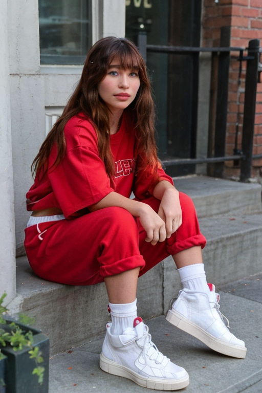 close up photograph of malina weissman, from side, sitting on the stoop, sweatpants, red shirt, sporty fashion, hi-top sneakers, shoes, nyc, hands folded, concrete, long brown hair, white socks, brick townhouse, movie still <lora:Malina_Weissman:0.85>