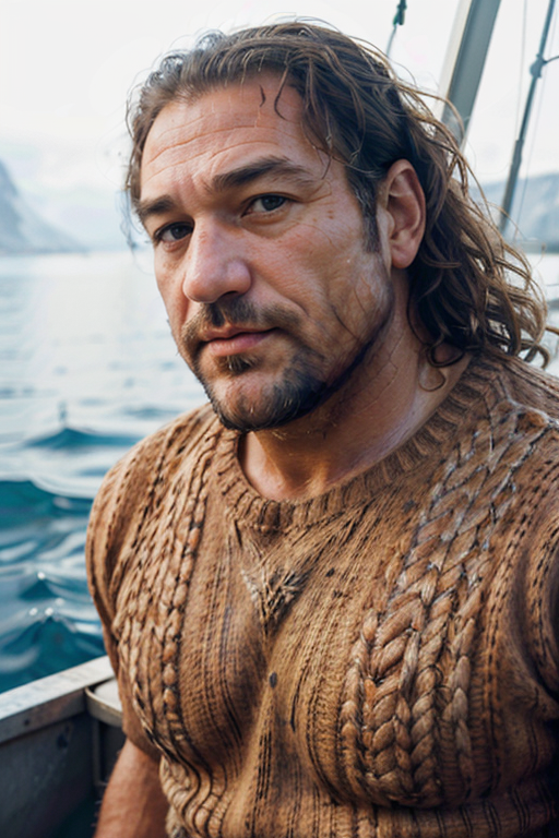 a portrait of n0ah_n0texist wearing a thick woollen sweater at sea on a fishing boat, looking at the camera, facing the camera, dynamic lighting, photorealistic, high detail, detailed, masterpiece, 8k, highres, flawless, colour, professional