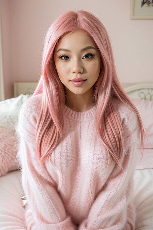 8k,masterpiece,1girl,realistic,finely detail, long straight (bright pink hair, 1.1),asian,laying on bed, kissing lips, ult4s0ft, knitted sweater, fuzzy sweater,