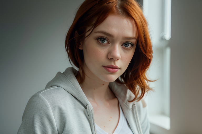 portrait of DEN_lass_SG, (headshot, face focus:1.2), beautiful eyes, detailed face, detailed lips, letter graphic zip up hoodie and denim skirt with knee high boots, (plain background:1.2), bokeh, f1.4, 40mm, photorealistic, raw, 8k, textured skin, skin pores, intricate details, <lora:epi_noiseoffset2:1>, epiCRealism