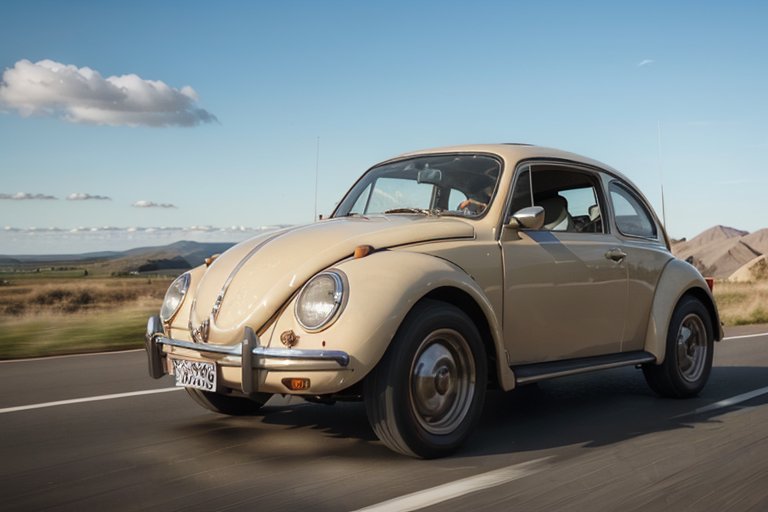 ((three quarter view)), (best quality, masterpiece, award winning), analog photo of a beige Volkswagen Beetle car, golden hour, 1969, film grain, retro, High Detail, Sharp focus, photorealism, realistic, dramatic lighting, epic,cinematic. widebody sports car, lowered, large box fenders, deep dish rims, racing wheels, ground vehicle, motor vehicle,