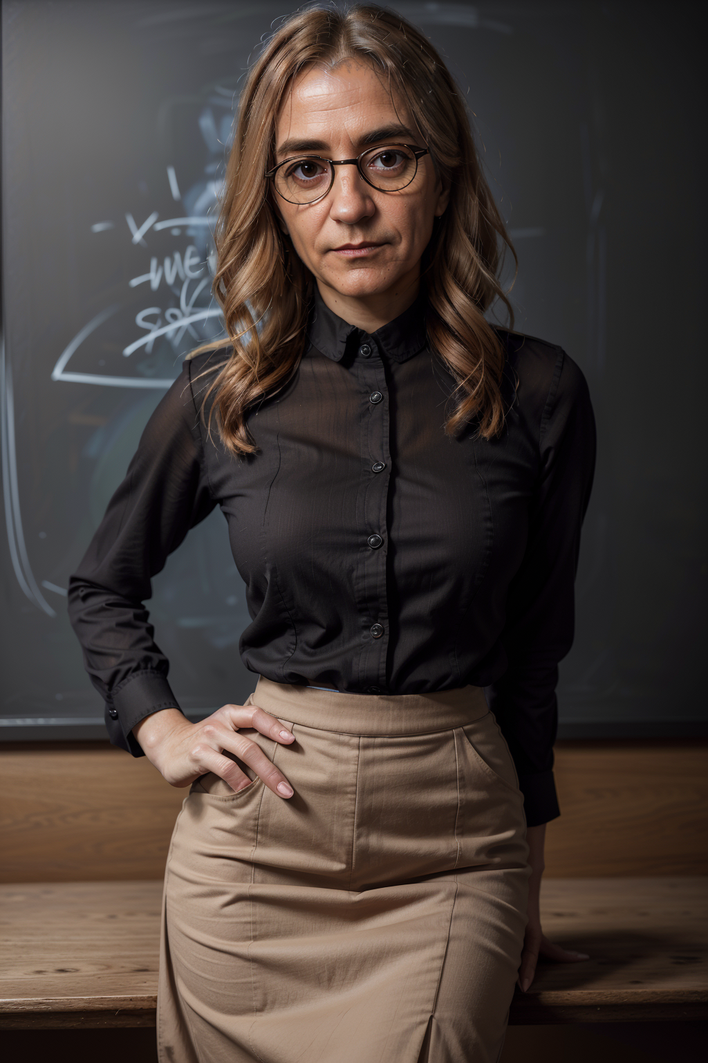 a portrait of l1zzie_n0body wearing a blouse and a pencil skirt, spectacles, standing in front of a blackboard, teaching [centre frame], looking at the camera, facing the camera, dynamic lighting, photorealistic