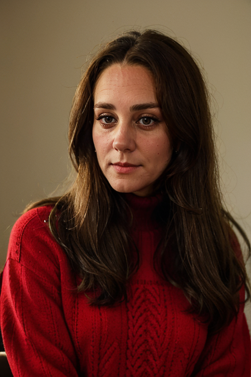 a 40 year old c1873em, wearing Blood Red jumper <lora:Catherine_Middleton-000010:1> 1girl, solo, realistic, long_hair, c1873em,