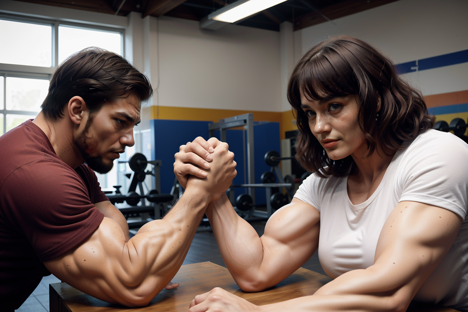 1girl 1man, armwrestling, skinny tiny girl and huge man, wearing shirts, in a gym, effort and straining, <lora:armwrestling:1>, A stunning intricate full color portrait of , analog style, sharp focus, natural lighting, subsurface scattering, f2, 35mm, film grain