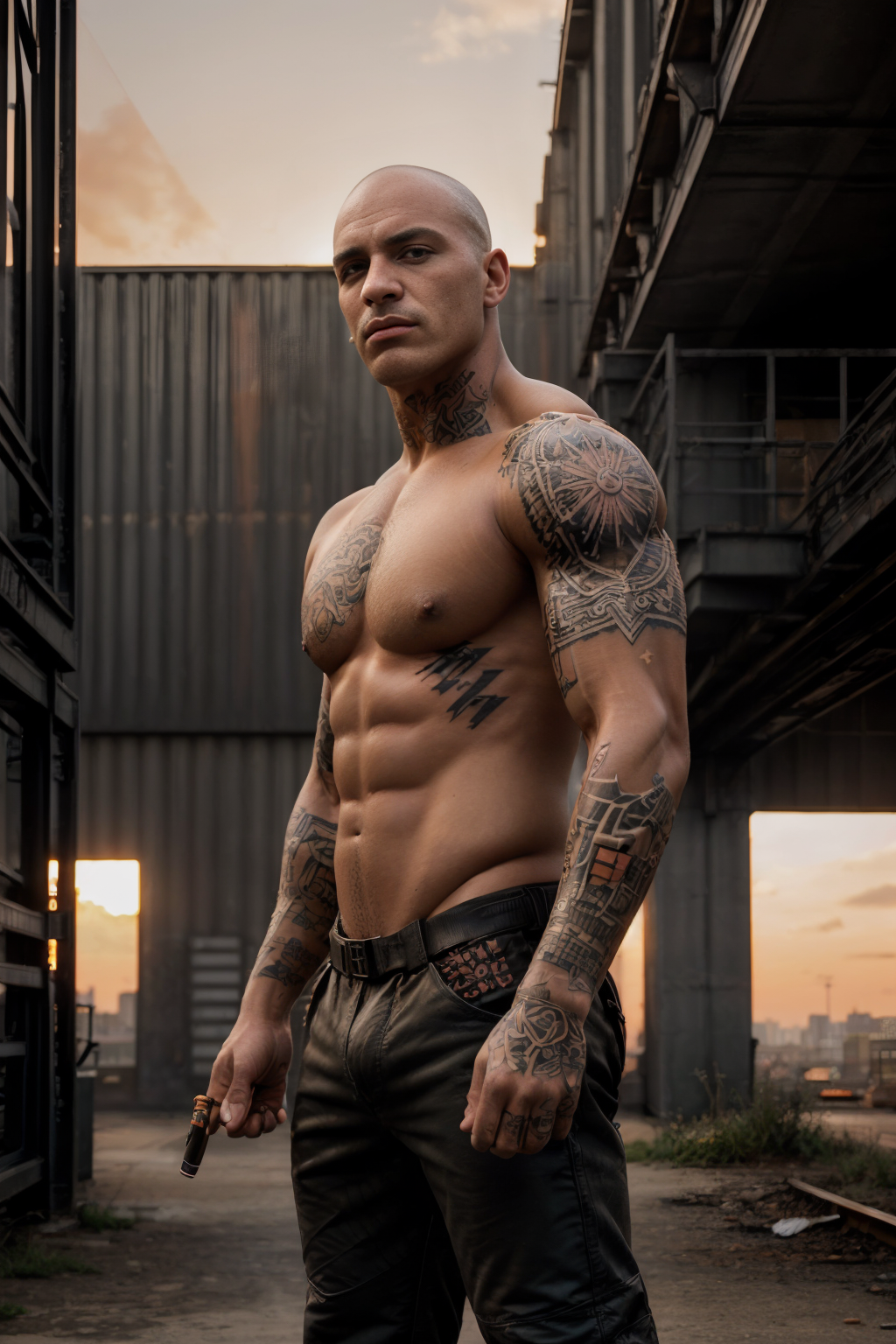 (masterpiece, best quality, 4K, urban art:1.4), a resolute skinhead with a (shaved head:1.2), (imposing physique:1.3), proudly showing off his (intricate tattoo artwork:1.4), (shirtless:1.1), donning (tight briefs:1.2) and (rolled-up utility pants:1.1), standing boldly in an (industrial backdrop:1.2), (steel beams:1.1), (weathered walls:1.2), (cigarette in hand:1.2), (unwavering gaze:1.1), (focused expression:1.2), (military-style boots:1.1), (warm sunset glow:1.2), determined energy, close-up shot, warm tones, urban ruggedness <lora:add_detail:1.2> <lyco:GoodHands-beta2:1.0>
