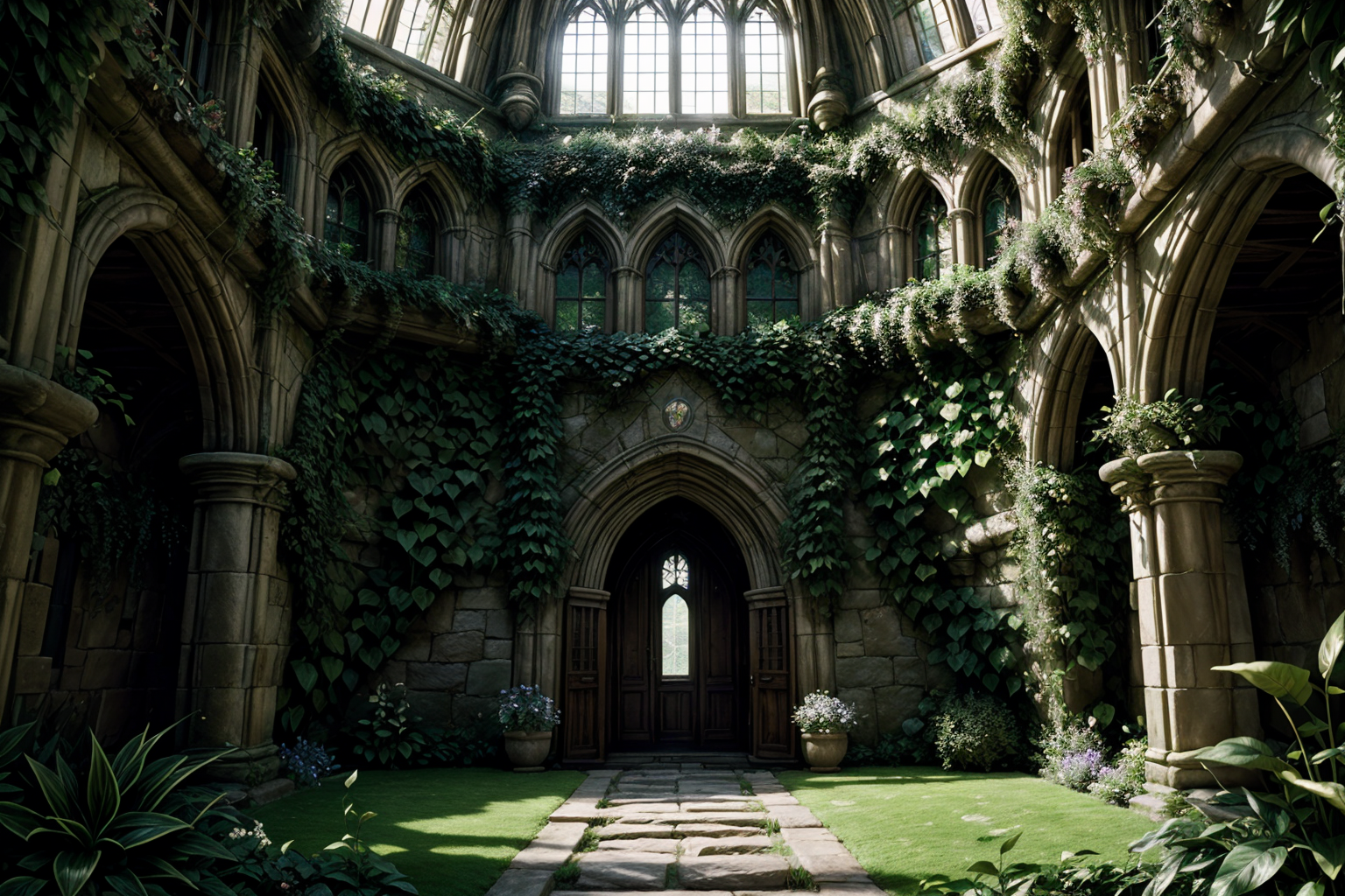 (masterpiece, detailed illustration, fantasy art:1.3), the botany chamber within the castle of Hogwarts, (imposing stone walls adorned with climbing vines:1.2), (bountiful shelves overflowing with potted plants and herbs:1.1), (rainwater trickling down magical irrigation systems:1.2), (sunlight streaming through glass ceilings, bathing the room in a soft glow:1.2), (whispering leaves revealing the secrets of nature:1.1), (students tending to their magical plants with care:1.2), (sense of tranquility and harmony with nature:1.1), (captivating and immersive composition:1.2), allowing you to experience the enchanting botany chamber of Hogwarts firsthand. <lora:add_detail:0.75>
