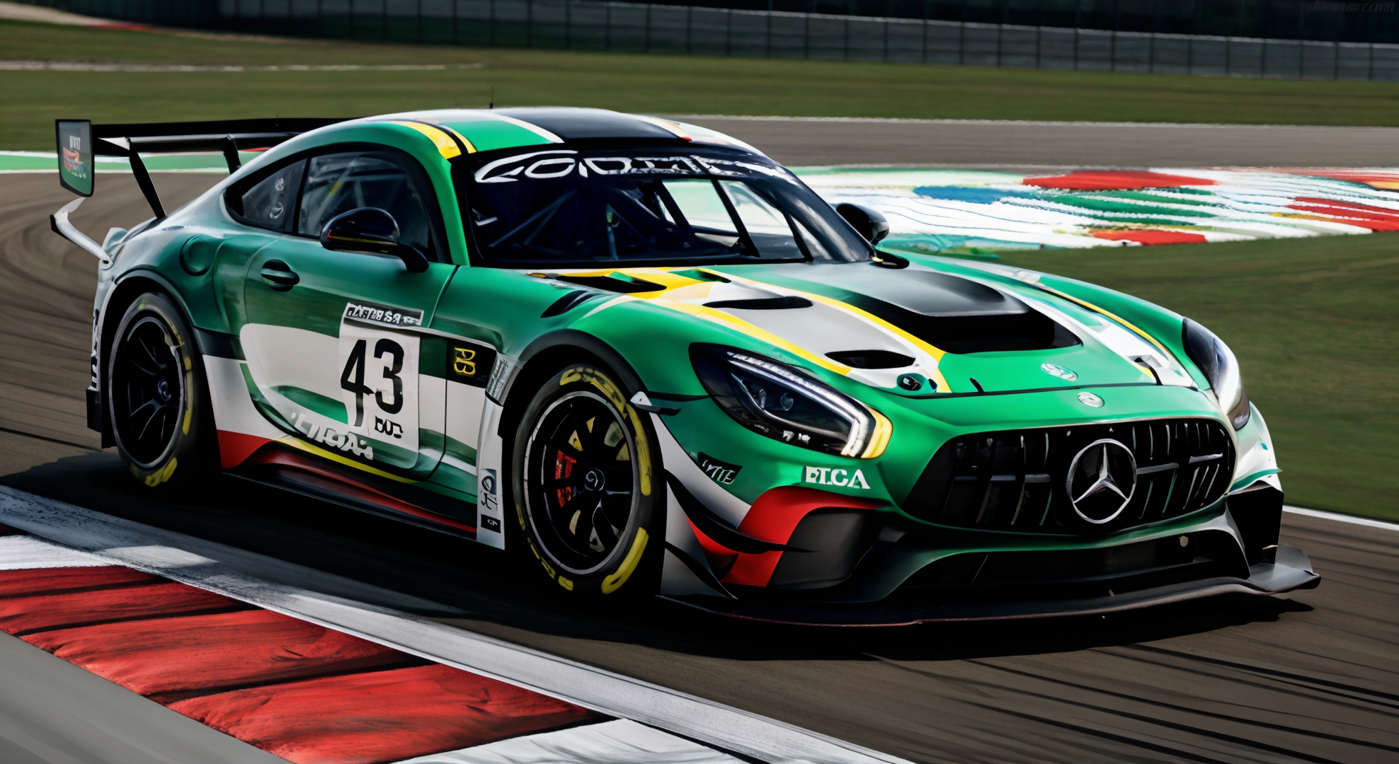[Mercedes AMG GT3 | gt3 racing car] on a race track ((noon)), outdoors, intricate livery, masterpiece, realism, hyperrealism, cinematic, intricate details, rtx,