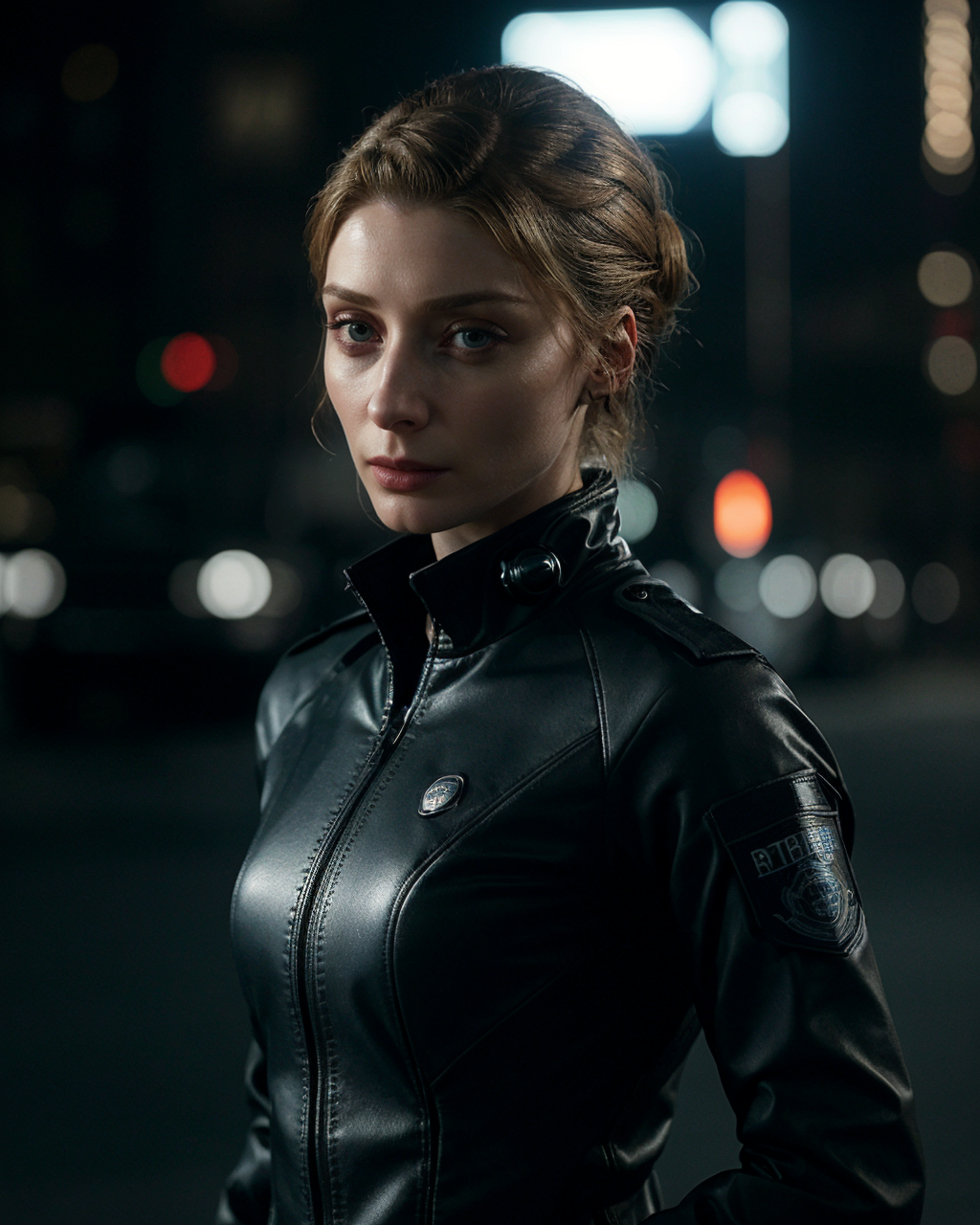 cinematic film still Techwear fashion female police detective [elizabeth debicki] is being extremely smug and judgmental . Futuristic, cyberpunk, urban, tactical, sleek, dark, highly detailed . shallow depth of field, vignette, highly detailed, high budget, bokeh, cinemascope, moody, epic, gorgeous, film grain, grainy