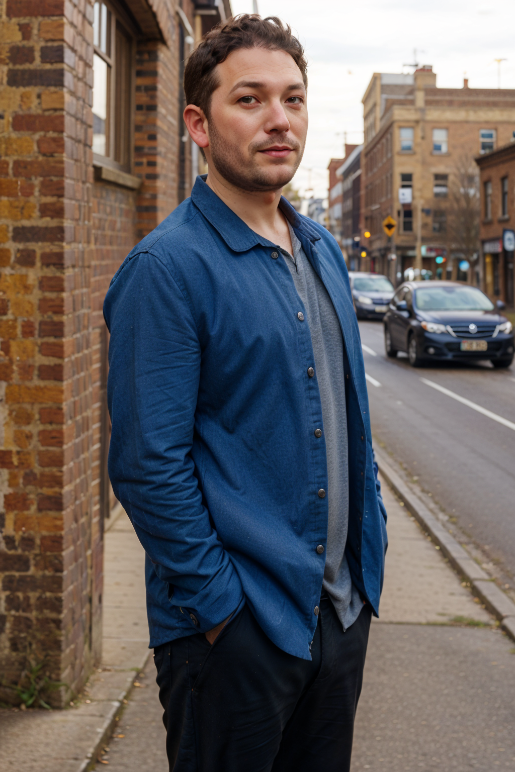 looking at viewer, jon richardson, man standing, portrait, street, daytime <lora:JonRichardson:1>