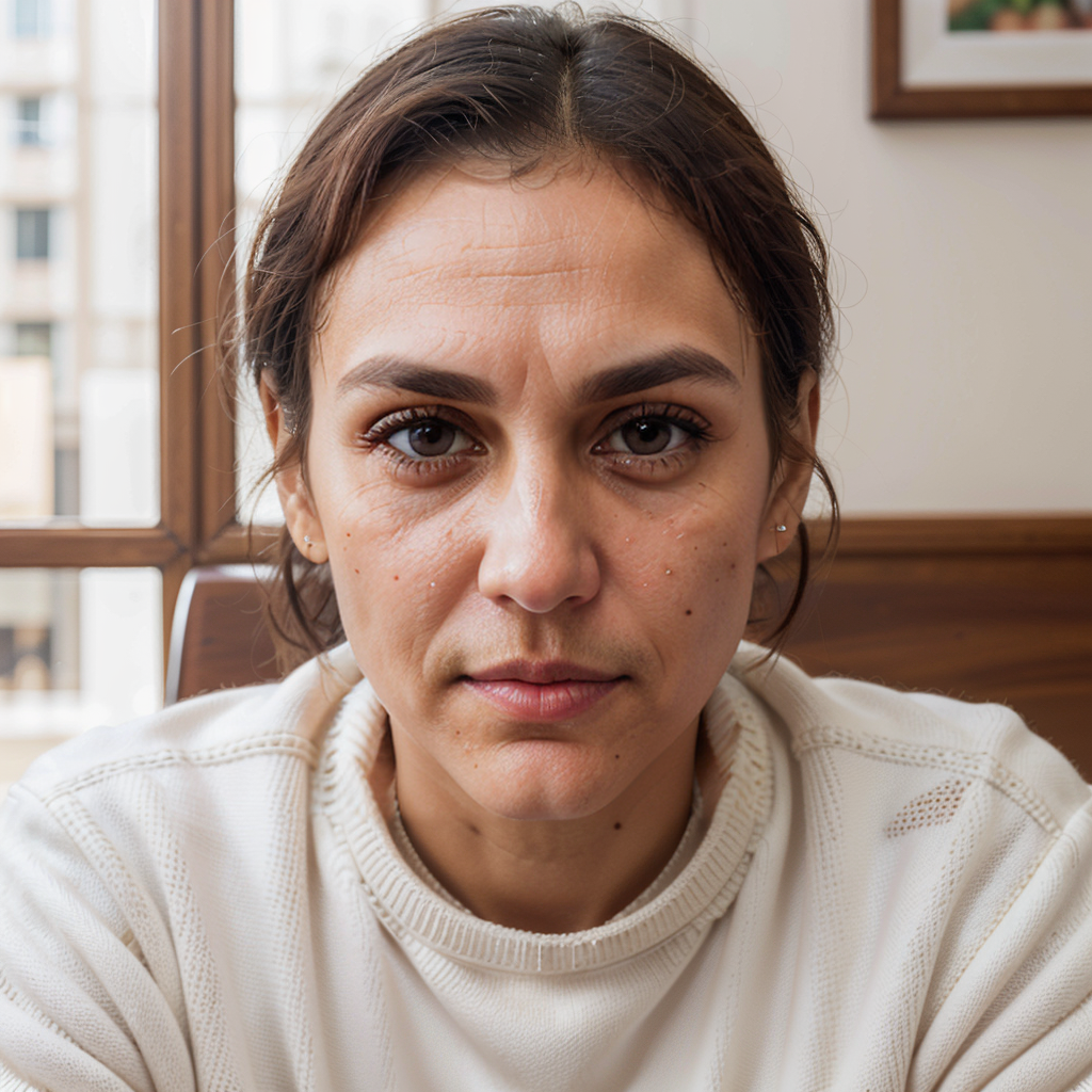 extreme close up marc1a_n0texist in a cafe, ((wearing a sweater )), looking at the camera, facing the camera