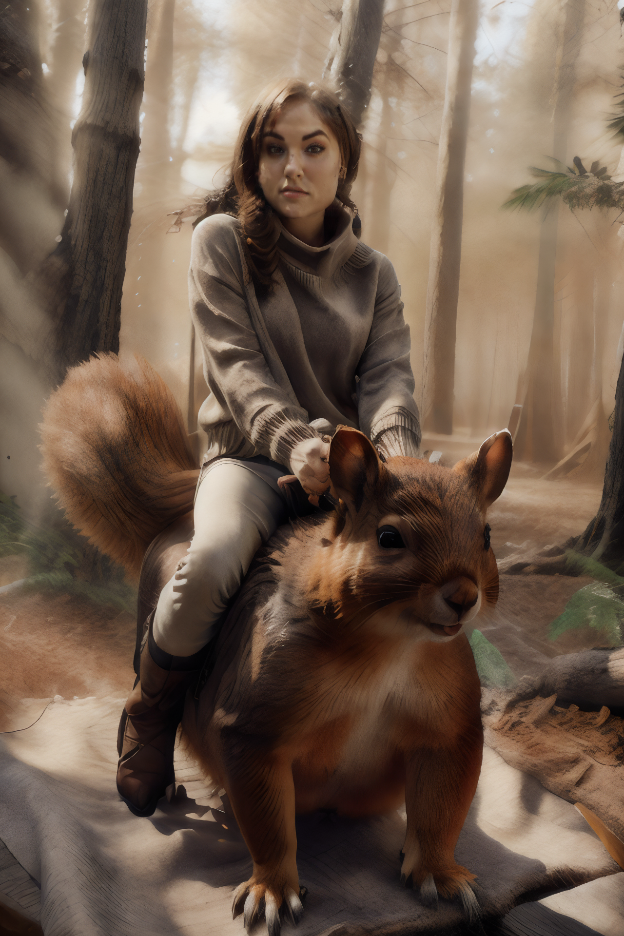 <lora:SashaGrey-000005:1> sashagrey koh_sashagrey <lora:SweaterPullovers:1> edgpo, wearing edgPO pullover, sweater, lether shoes <lora:riding_a:0.7> an girl riding on a giant squirrel, forest landscape, winter <lora:booscapes:1> booscapes <lora:more_details:1>