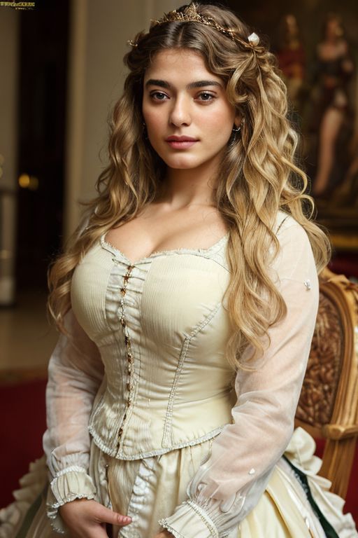 Photo of a woman, highres, (((photorealistic))), ((best quality)), ((masterpiece)), (soft even lighting), (medium body photo),realistic style, looking at the viewer), ((victorian princess clothes)), eye contact, ((blonde wavy hair))