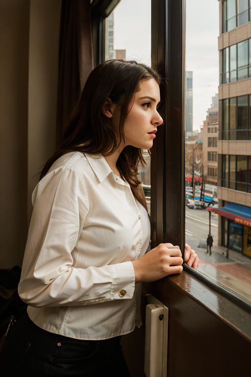 a portrait of woman looking through window in big city, machines around, detailed world background, warrentufts