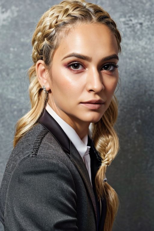 ASCIIPhoto of a woman, ((wearing a suit)), ((plain background)), (braided white hair), eye contact, best quality