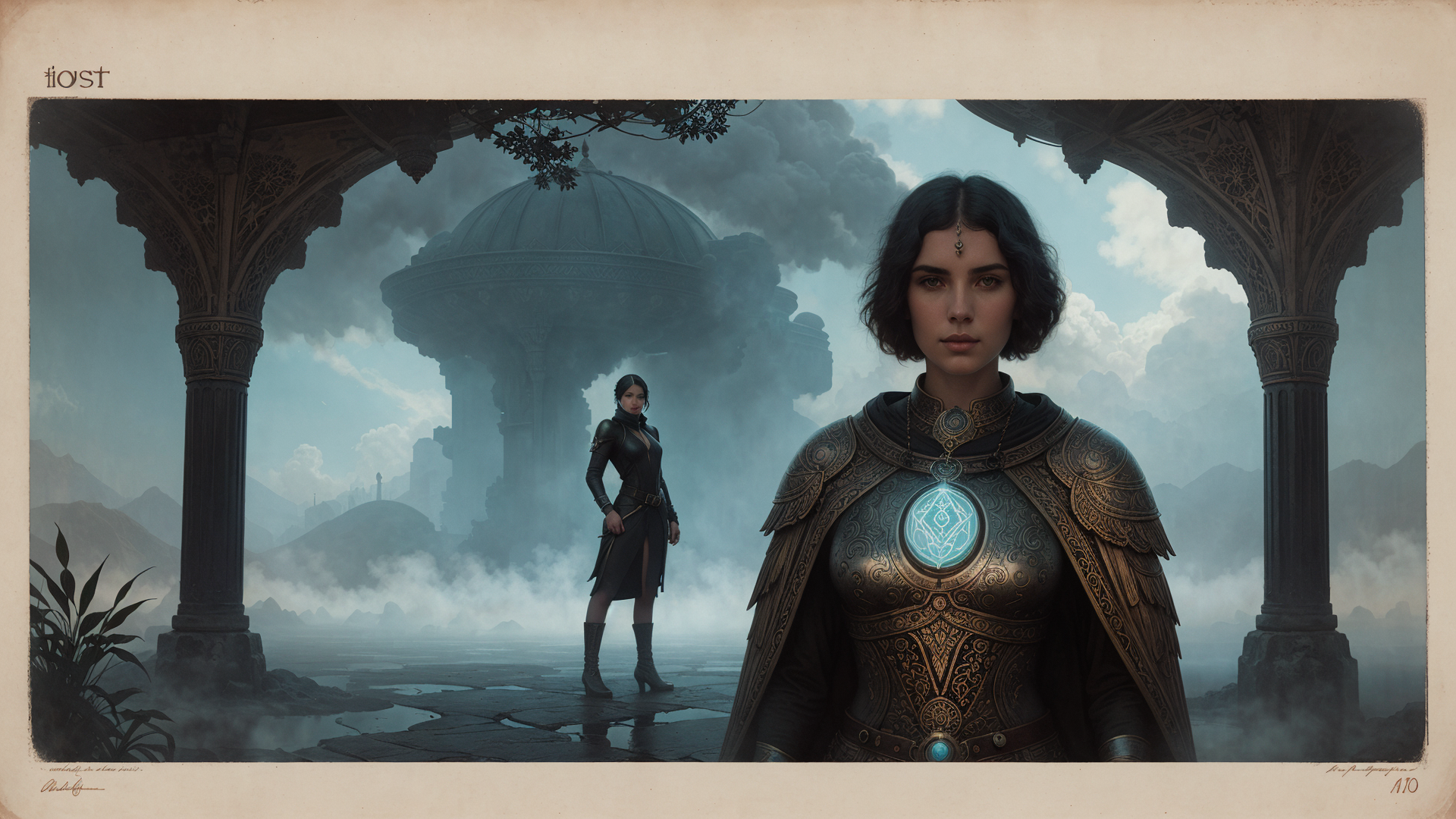 Amulet of Steam, Lost Oasis, Woodcut Print in Tom Bagshaw style, Retro-Futuristic, Cinematic, trending on deviantart, Inverted Colors