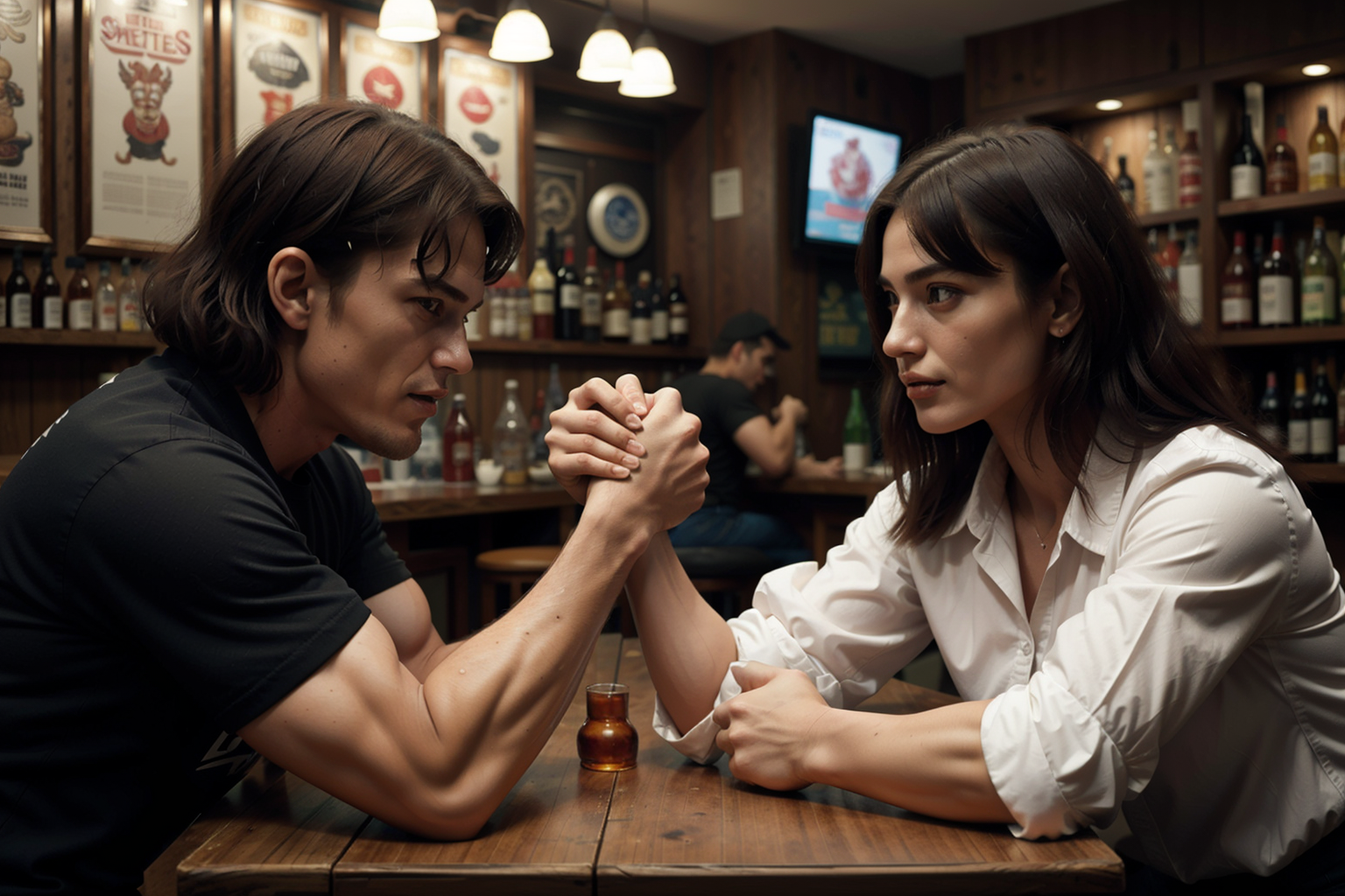((1girl 1man)), armwrestling, two normal people, wearing casual clothes, in a bar, effort and straining, <lora:armwrestling:1> analog style, sharp focus, natural lighting, subsurface scattering, f2, 35mm, film grain