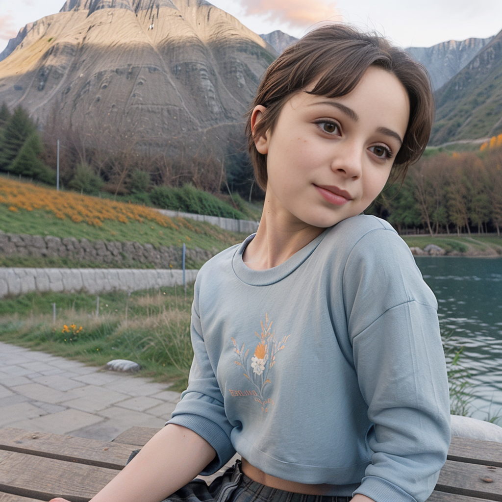 L1bus3_S4fr4nk0w4, sitting on a bench by a lake in the mountains, wearing a blue sweatshirt with shorts, ((closeup:1.1) upper body view from side), short hair cut, bright evening, orange sundown light, highly detailed
