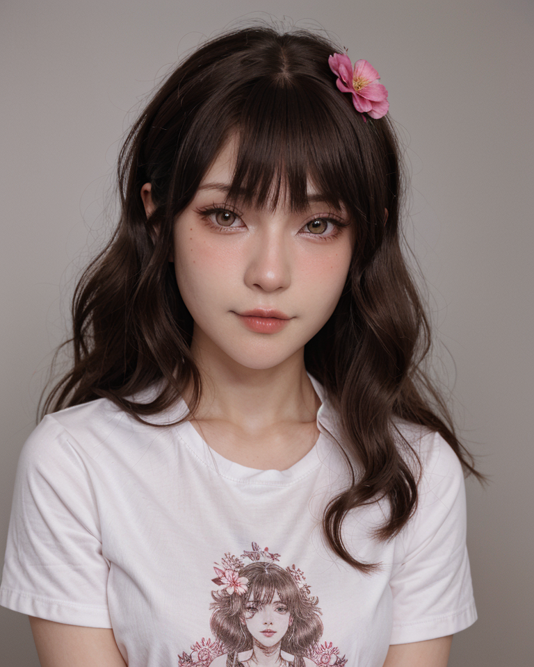 yujikoi, a woman, ((extremely detailed face)), modern clothes, T-shirt, floral t-shirt, messy hair, wavy hair, bangs,