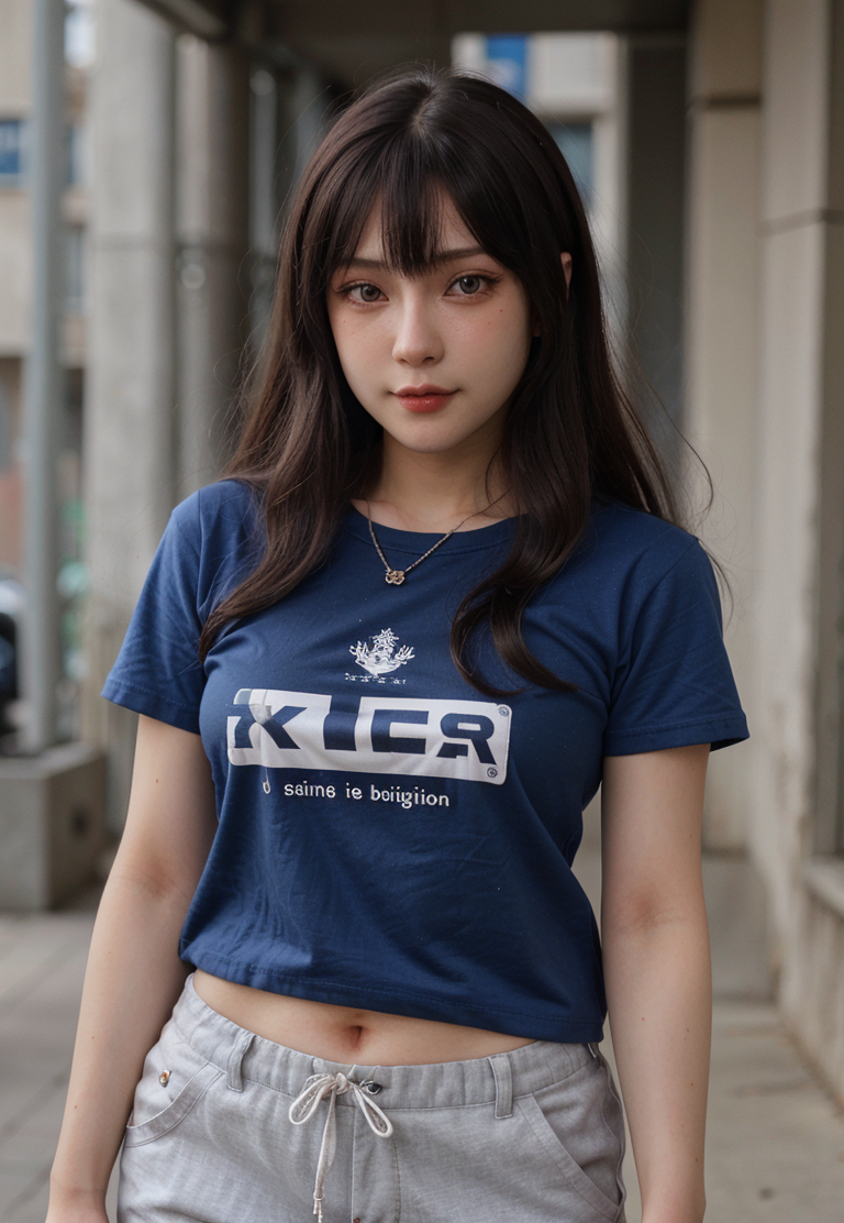 yujikoi, a woman, ((extremely detailed face)), modern clothes, T-shirt, blue t-shirt, english text, pants,