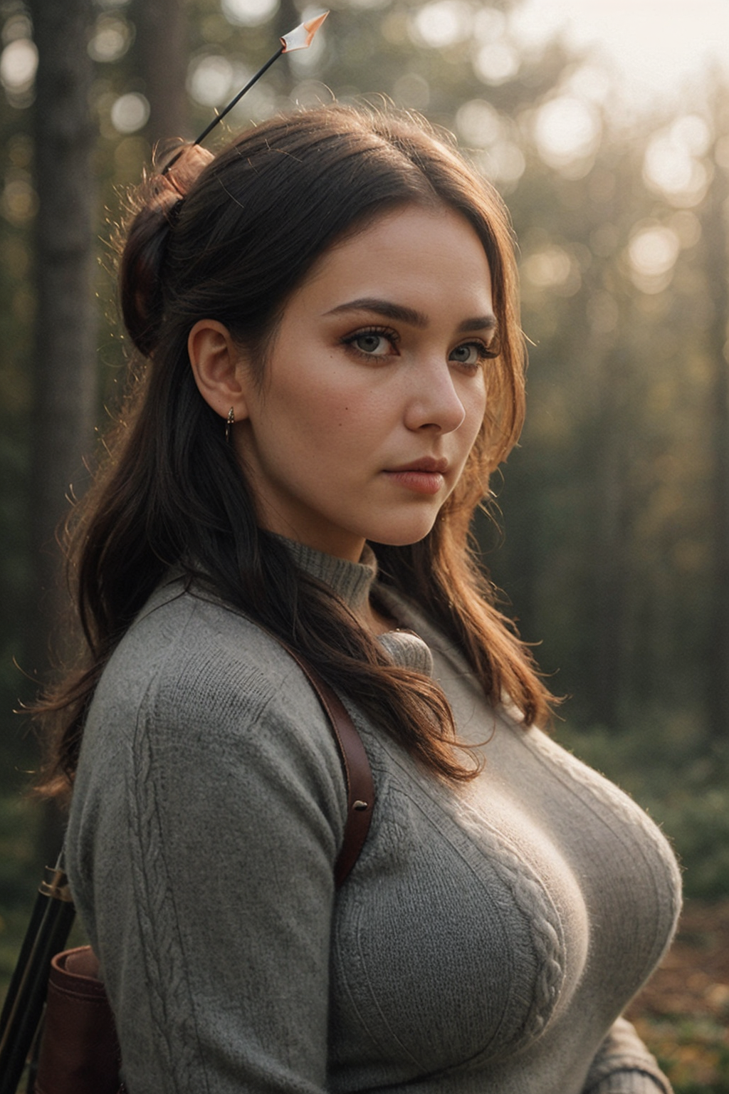 full body shot, super cute woman, archer outfit, grey Cable-knit sweater, leather skirt, archer, (woman is holding arrow:1.1), slim, hanging breasts, small breasts, beautiful face, detailed skin texture, (blush:0.5), (goosebumps:0.5), subsurface scattering, medium brown hair, green eyes, (bow and quiver on back:1.2), leather straps for quiver, dramatic shadows and subtle highlights, warm tones, soft focus, depth of field, atmospheric lens, circular targets in background, forest background, fFaceDetail , <lora:AloeVera_Thiccness_Slider:-0.7>, <lora:breastsizeslideroffset:0.4>