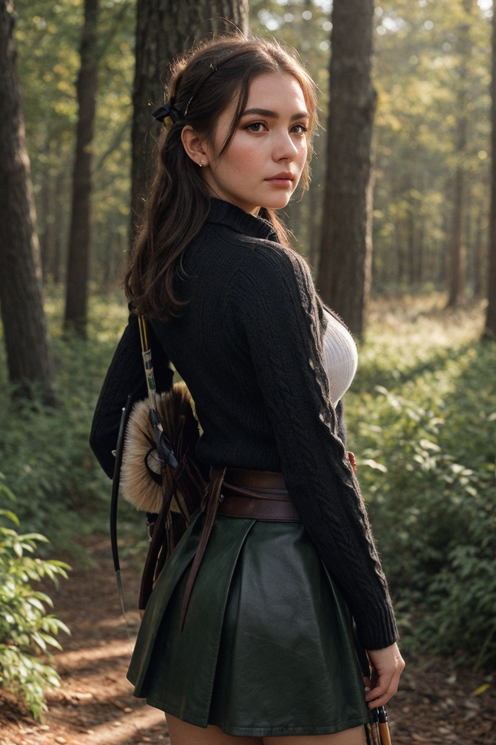full body shot, super cute woman, archer outfit, grey Cable-knit sweater, leather skirt, archer, (woman is holding arrow:1.1), slim, hanging breasts, small breasts, beautiful face, detailed skin texture, (blush:0.5), (goosebumps:0.5), subsurface scattering, medium brown hair, green eyes, (bow and quiver on back:1.2), leather straps for quiver, dramatic shadows and subtle highlights, warm tones, soft focus, depth of field, atmospheric lens, circular targets in background, forest background, fFaceDetail , <lora:AloeVera_Thiccness_Slider:-0.7>, <lora:breastsizeslideroffset:0.4>
