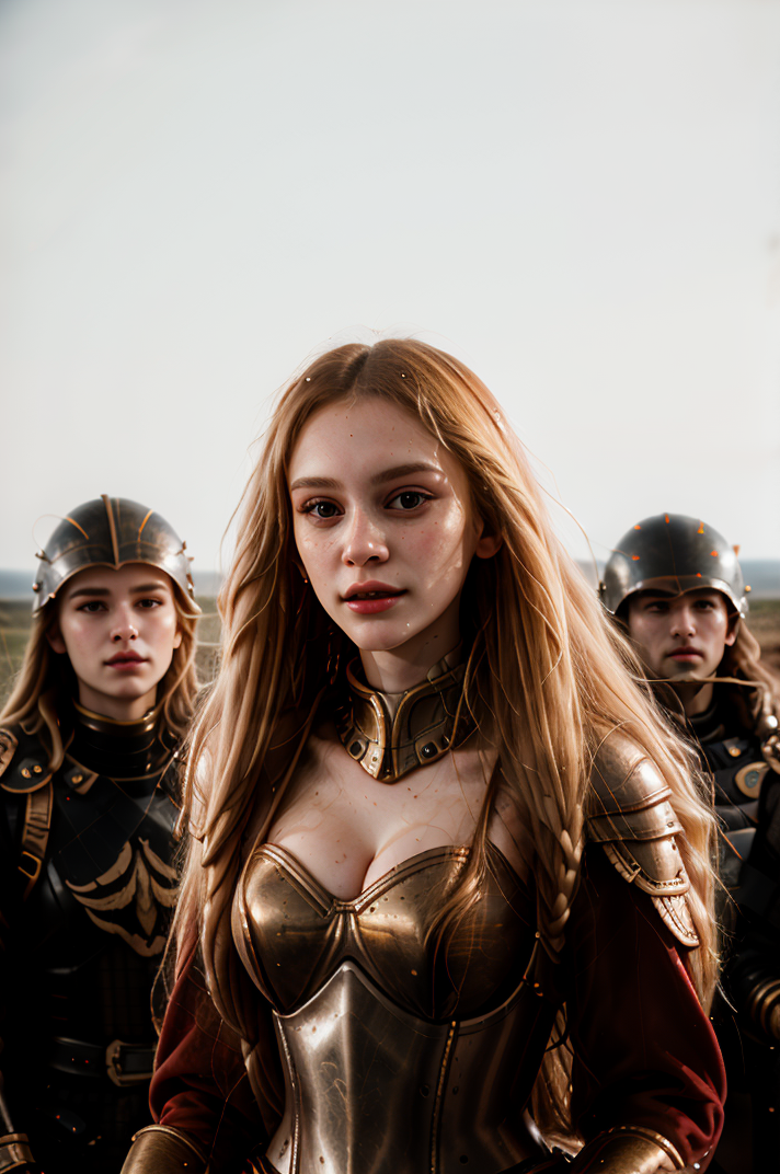tv_Daria2_MXAI, , , wearing full plate armor, in a battlefield, windblown hair, smudges, dirt, windblown hair,, 8k resolution, highres, high detail, sharp focus, detailed skin, 8k uhd, bokeh, analog photography