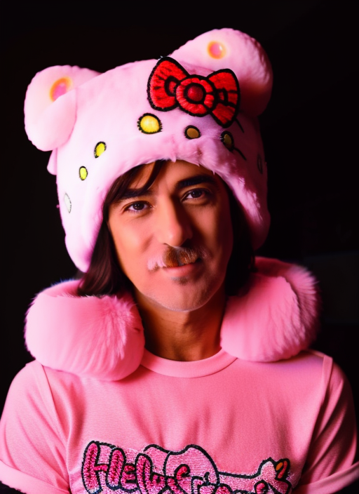 portrait of sks man (g4rcia:1) dressed with a (Hello KItty fur hat:1.3), neon lights in background, high detailed face, 4k, 8k, cinematic, <lora:g4rcia:1>