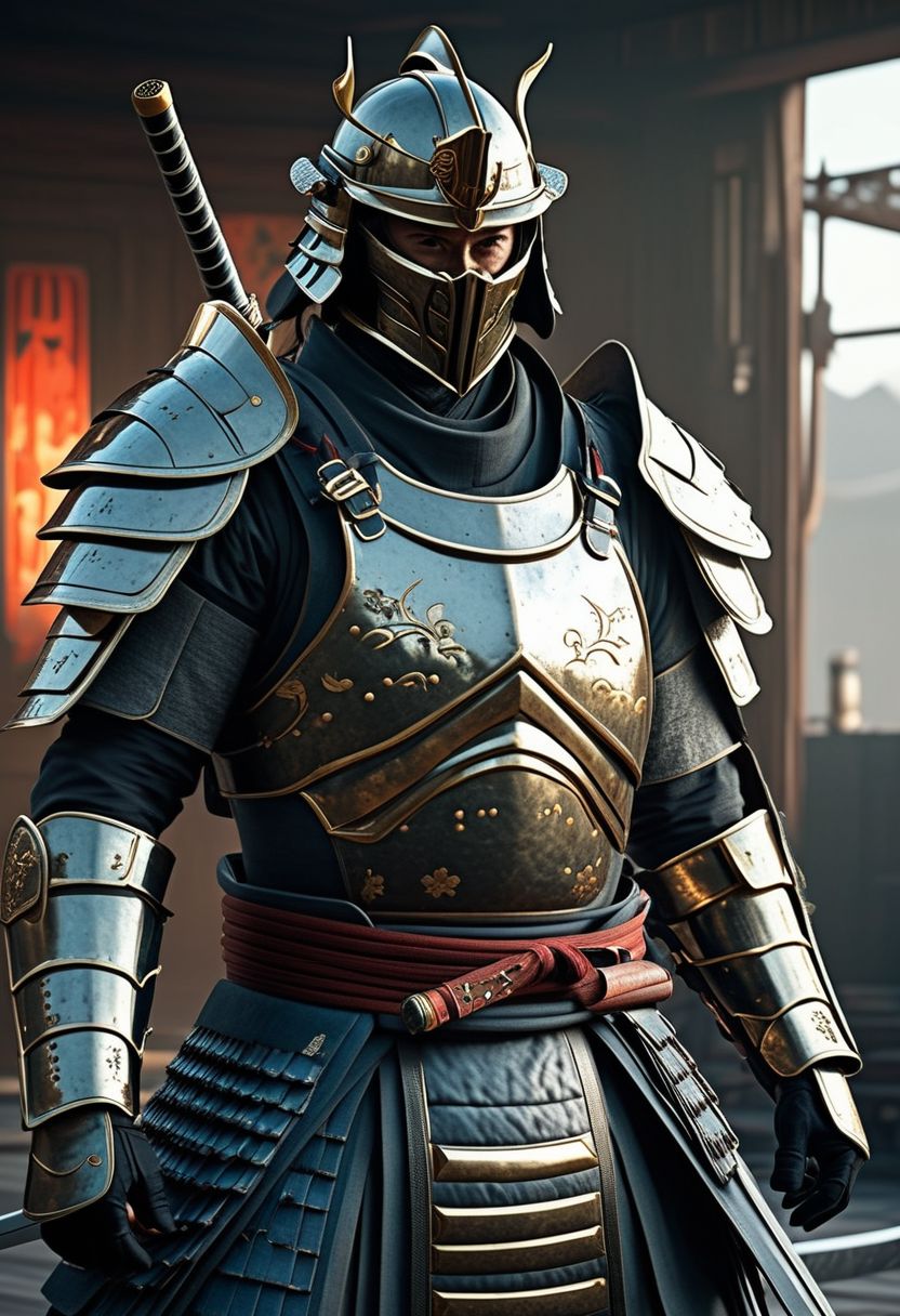 (A samurai in a retro futuristic style, similar to fallout 4, wearing powered samurai armor of the future. Natural lighting, sharp edges, katana in scabbard.), (The image is exceptional, advanced rendering techniques and rich contrast makes the scene come alive. The shadows and light interact to create depth and rich textures.), (masterpiece, age difference, cinematic quality, photorealistic, photo studio quality, realistic, extremely high detail, intricate detail, detailed face and skin, realistic skin textures, realistic facial features, extremely high detail faces, incredibly lifelike, expressive faces, high resolution, 8k, 4k, UHD, HDR, tack sharp, sharp focus, exceptionally realistic.)