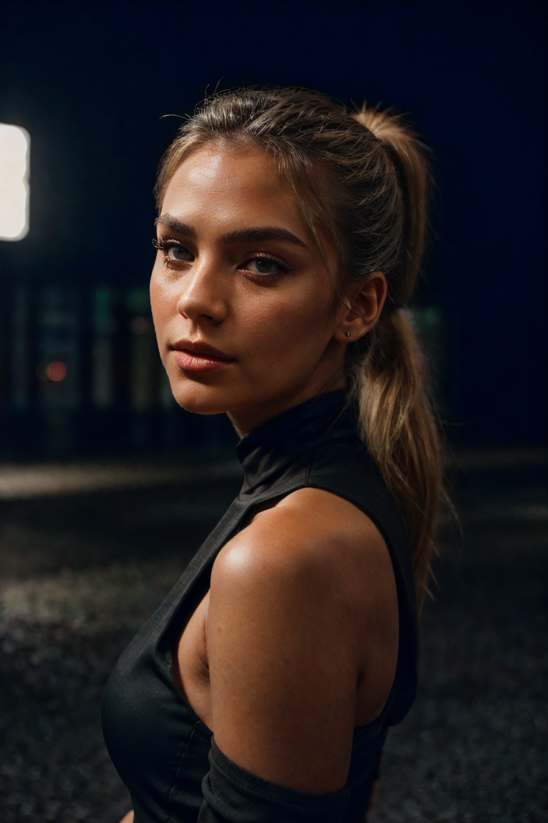 wearing black dress, blonde ponytail, green eyes, parking garage by night, DARK THEME, (masterpiece, heavy shadow, dramatic lighting) natural skin, 8k uhd, high quality, film grain, Fujifilm XT3, (whofja2.0-7500:0.8) <lora:add_detail:1.2> <lora:LowRA:1>
