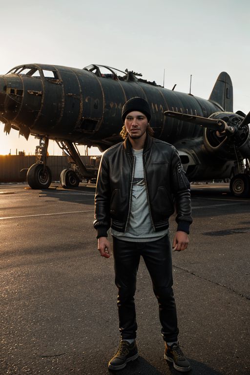 fullbody, a man (leather bomber jacket, beanie) standing in the abandon hangar,abandon airplane, cinematic color,broken airplane, broken wall, strong light from broken windows, very high detailing, photorealistic,HDR, 8K,RAW, sharp focus, photonealistic, Octane render, sharpness